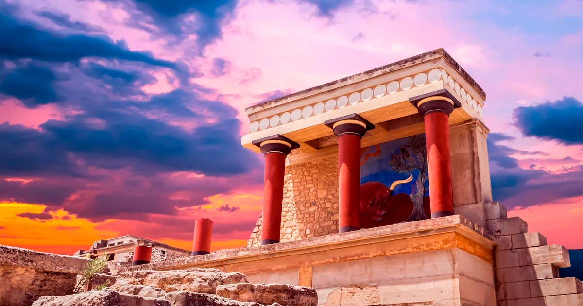 Imagen superior: Sección parcialmente reconstruida de las ruinas del Palacio Minoico en Knossos: se puede ver la representación de un toro. Fuente: Lucian Bolca / Adobe Stock.